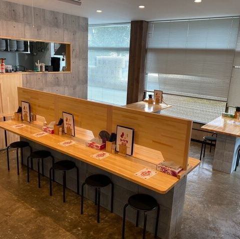 店名は赤字で記載されていて目印になり、レトロでかわいらしい外観が特徴のラーメン店で、温かみのある雰囲気を醸し出しています。店内に入ると、シンプルでありながらも清潔感あふれる広々とした空間が広がります。無駄のないインテリアと落ち着いた色合いが調和し、リラックスしてお食事を楽しむことができます。